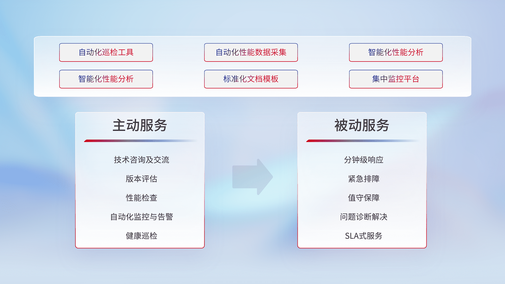智能化工具和标准化文档,,保障服务质量,,,,提供主动服务(包含技术咨询、、、、版本评估、、性能检查、、自动化监控与告警、、、、健康巡检)和被动服务包含(分钟级响应、、、、紧急排障、、值守保障、、问题诊断解决、、SLA服务)。。
