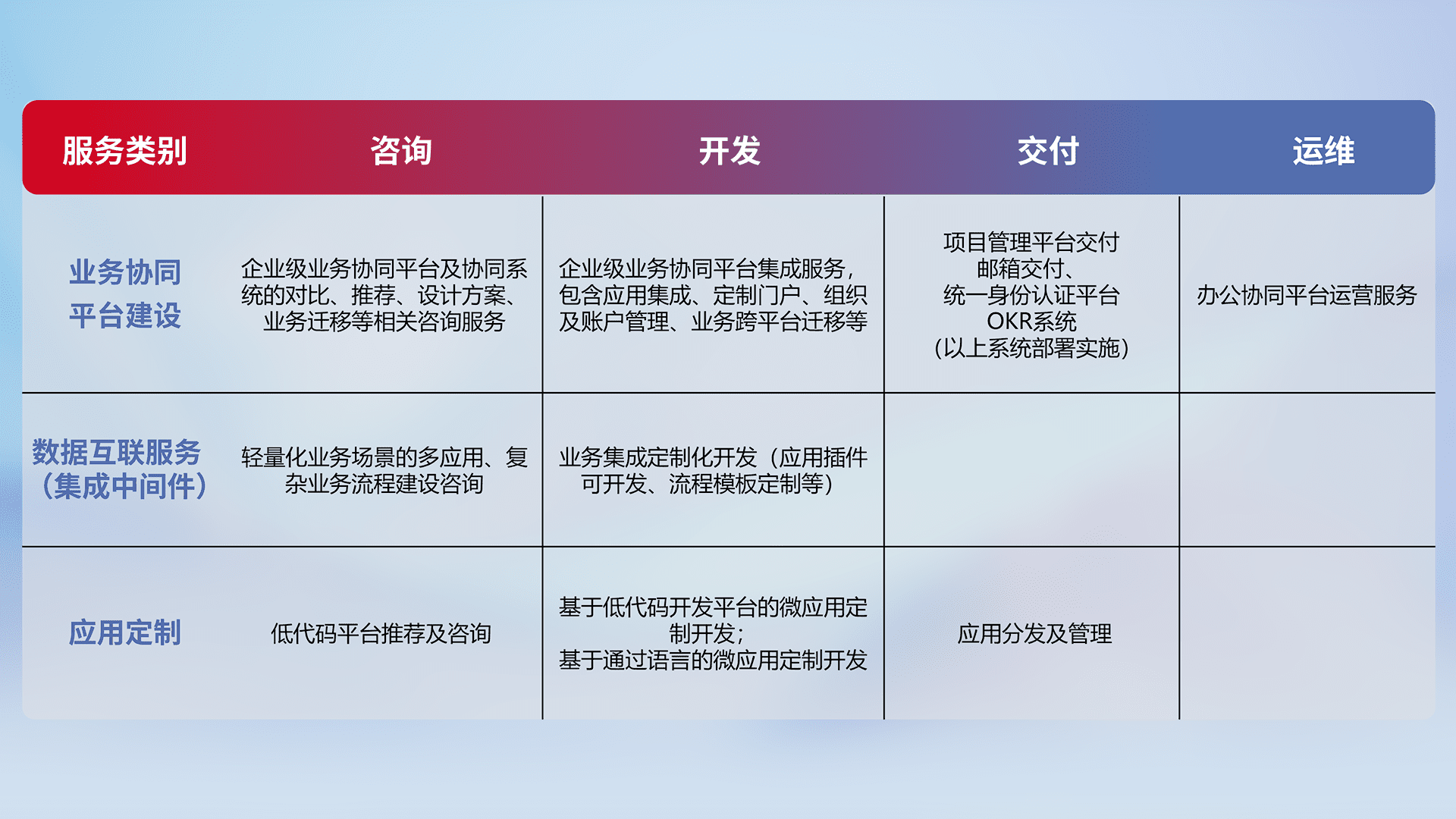 针对钉钉、、企微、、、、IDaas等平台级产品提供产品的规划、、、、方案、、交付、、、定制化开发等服务,,,,实现如统一协同办公、、智能客户服务、、混合会议管理、、、、智能数据查询、、、、等业务场景,,实现数字化转型。。。